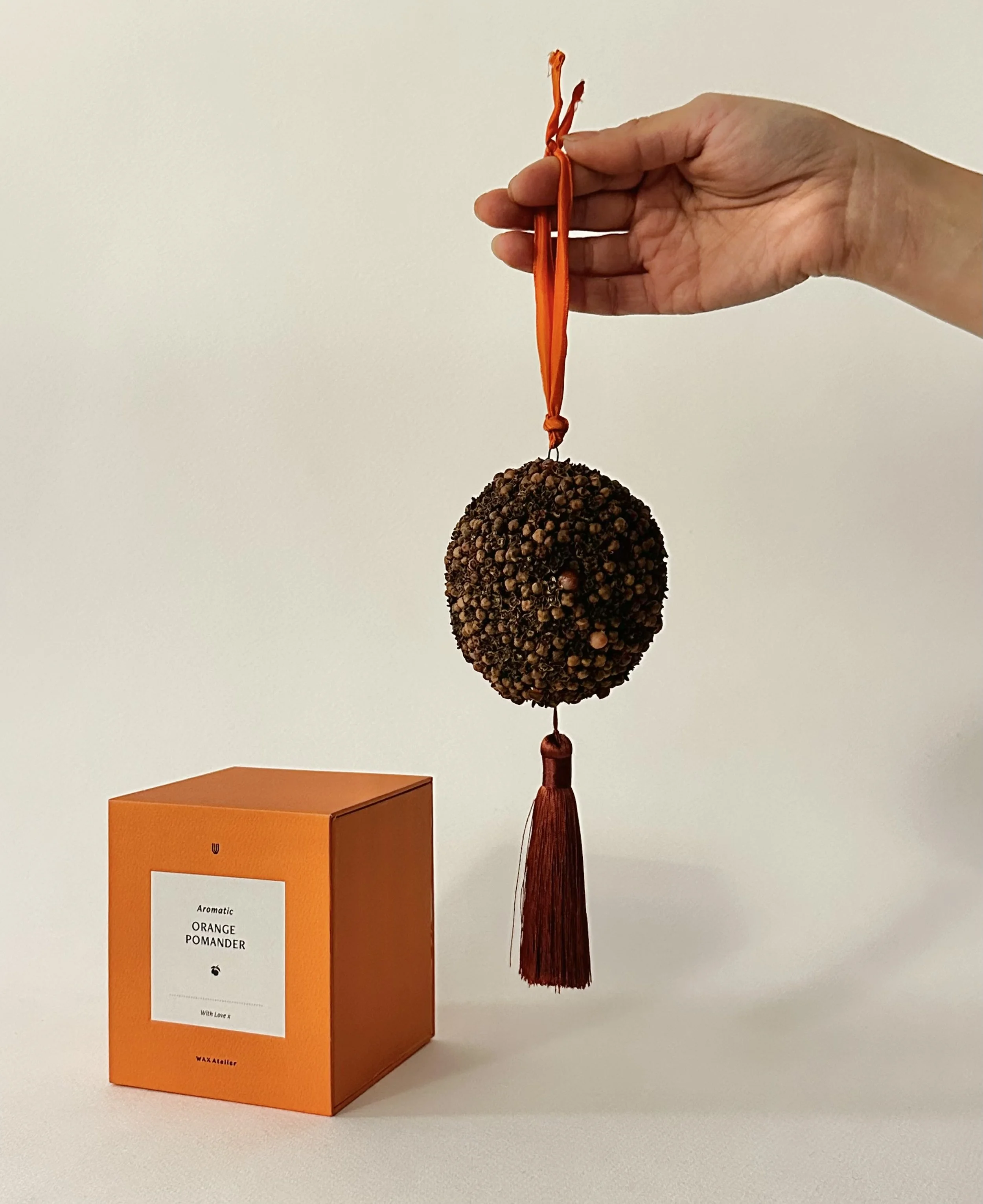 Using a unique blend of fruit waxes, aromatic resins, and essential oils from blood and bitter oranges, you’ll craft a lasting seasonal decoration, complete with a silk tassel for hanging, allowing its fragrance to gently fill your space or serve as a thoughtful gift.